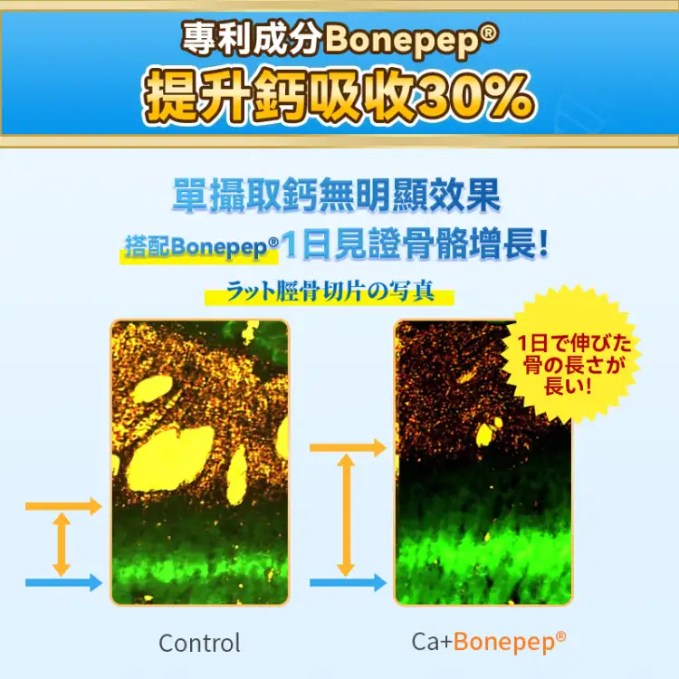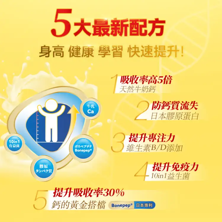 突破遗传,把握身高黄金阶段!1条成长饮=1条鱼+3杯高钙奶+1瓶益生菌!日本专利生长因子Bonepep® ,营养成分吸收率提升30%!超越旧式增高成长产品,令骨骼生长至最大限度。全方位复盖成长期营养,BB更高!更壮!更伶俐!更自信!